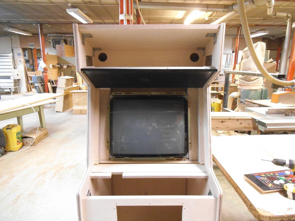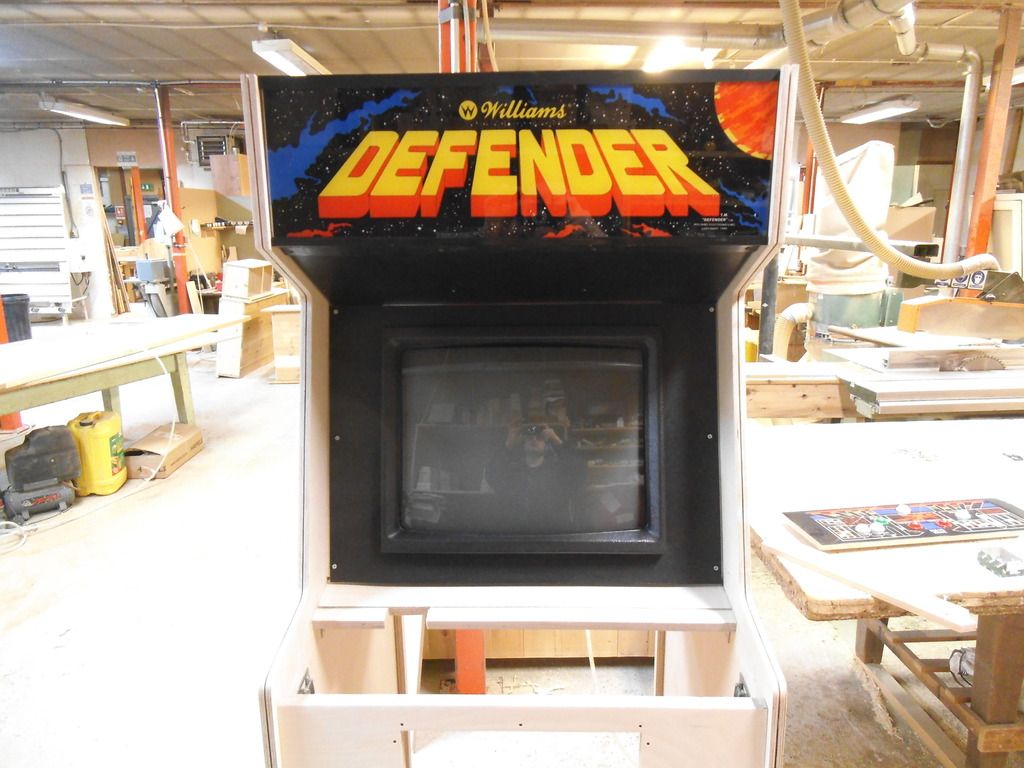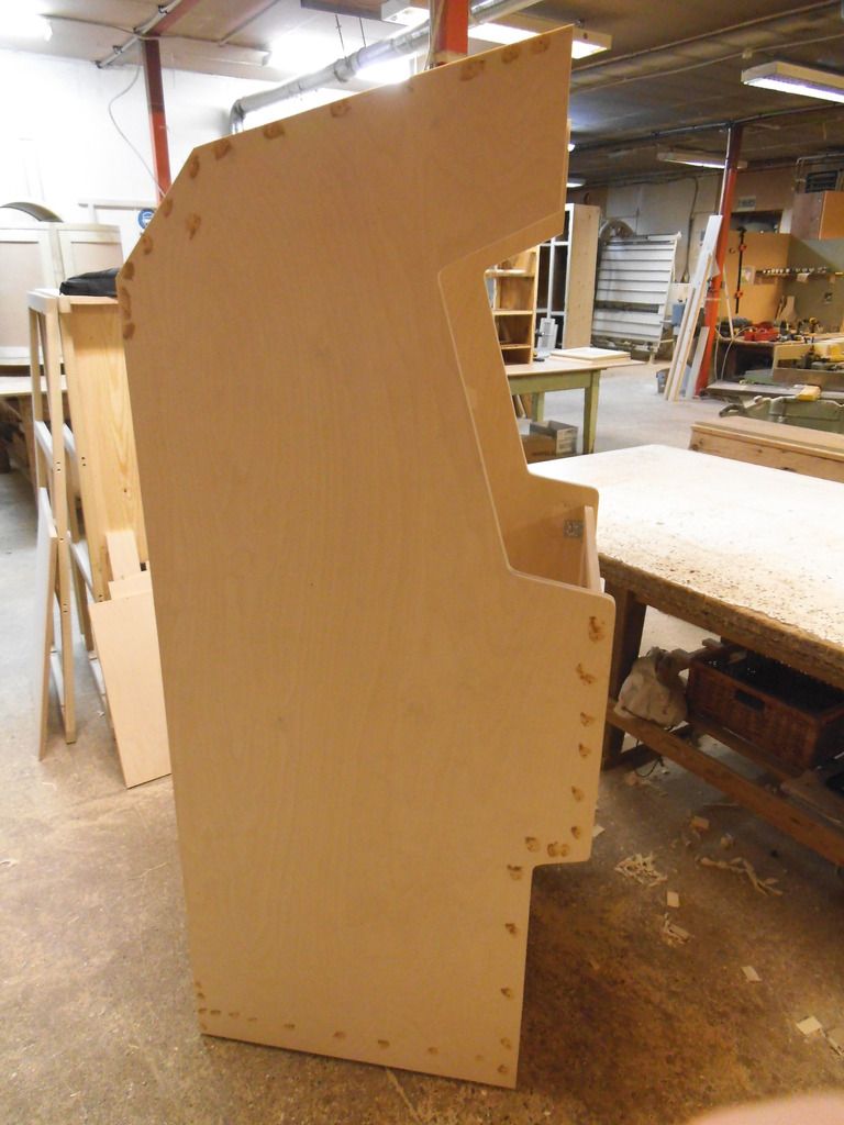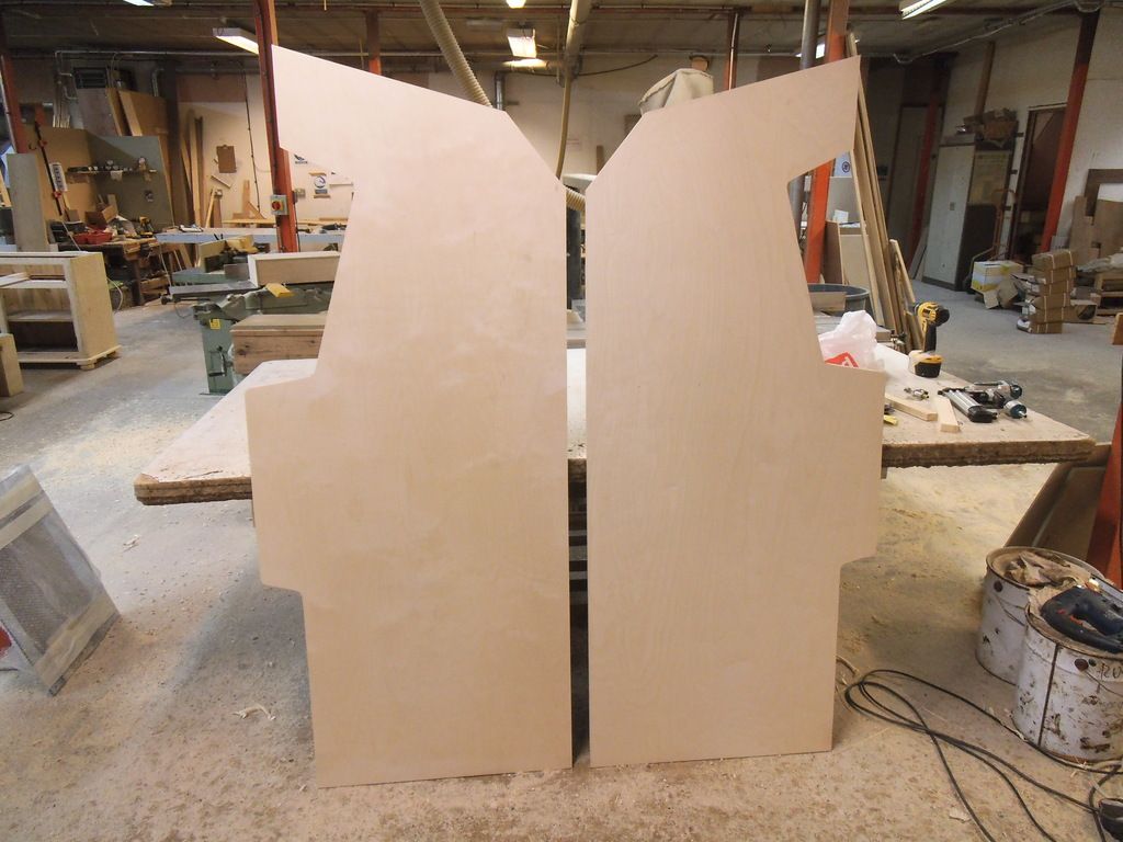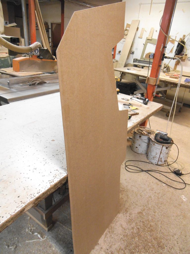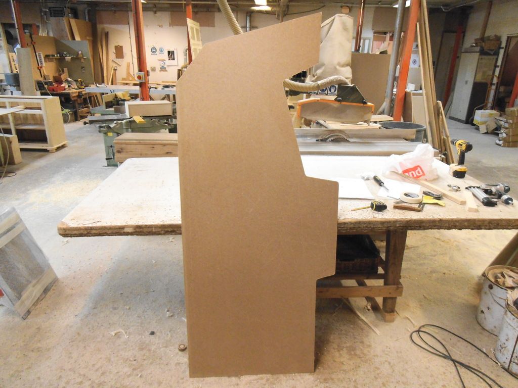 I did the same as my Robotron regarding the shape of the sides...I got a piece of hardboard and just basically pressed it up against the original cab and drew around the shape and then cut it out at work with a jigsaw...
